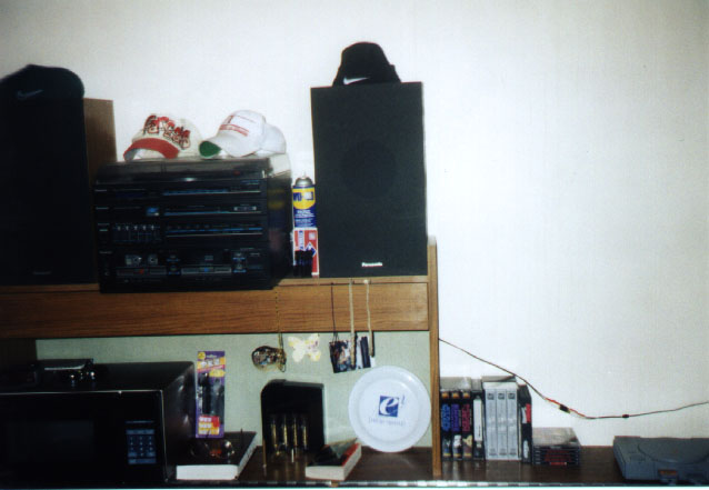 | K. This is where I lay my sweet head down to sleep. Well not exactly. My bed is right below this stuff.. Many imporant things here. The frisbee is the famous one that set off the alarm. I got my strike anywhere's. Wd40 for when you feel the need to take a door off queitly. My necklaces. Two of which were made by a certain someone. My stereo is there also. It is the bane to the existence of anyone on the 4th floor. Notice also the two copies of the Trilogy. THat's everything important. oops forgot the condoms. They were a gift from someone that didn't want them. You worry too much. |
